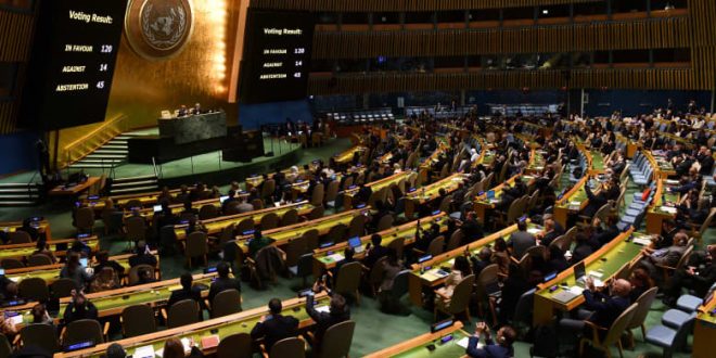 وصوتت 120 دولة لصالح القرار، في حين صوتت 14 دولة، بما في ذلك الولايات المتحدة وإسرائيل، ضده، وامتنعت 45 دولة عن التصويت.