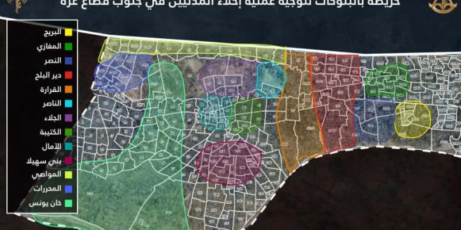 وتابع: “في منطقة جنوب القطاع: سكان خربة خزاعة وعبسان وبني سهيلا ومعن.. سكان بني سهيلا المقيمين في البلوكات 217 ، 218 ، 219 ، 220 ، 42 ، 45 ، 50.. حفاظاً على سلامتكم، إننا ندعوكم لإخلاء منازلكم فوراً والتوجه إلى مراكز الإيواء المعروفة في رفح.. سكان القرارة المقيمين في البلوكات الآتية: 39، 224، 2250، 2260، 2270، 2280، 2351، 132، 136، 137، 138، 139: حفاظاً على سلامتكم، إننا ندعوكم لإخلاء منازلكم فوراً والتوجه إلى مراكز الإيواء المعروفة في رفح وإلى المنطقة الإنسانية في حي المواصي”.
