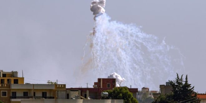 ويظهر مقطع فيديو حصلت عليه أعمدة من الدخان الأبيض فوق مشارف البلدة الواقعة على قمة التل، قادرة على تأكيد استخدام الذخائر الفسفورية.
