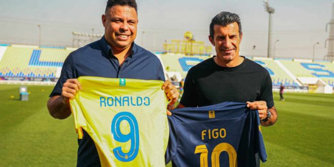 زار نجم لعبة كرة القدم البرازيلي السابق رونالدو ونظيره البرتغالي لويس فيغو مقر نادي النصر السعودي، السبت.