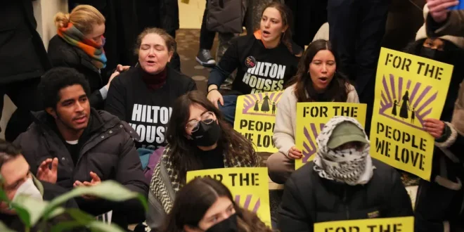 اعتقلت قوات الأمن الأميركية، يوم الأربعاء، عشرات المتظاهرين، بعد اقتحامهم ردهة فندق “هيلتون غاردن إن” في مانهاتن بنيويورك، متهمين الفندق بإيواء ضباط هجرة اتحاديين.