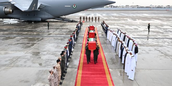 وبحسب وكالة “وام”، فقد “وصلت إلى مطار البطين الخاص بأبوظبي، صباح الأحد، جثامين شهداء الوطن الأبرار الأربعة وهم: (العقيد محمد المنصوري، والوكيل/ 1 محمد الشامسي، والوكيل/ 1 خليفة البلوشي، والعريف سليمان الشحي)، على متن طائرة عسكرية تابعة للقوات المسلحة”.