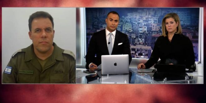 وواجهت مذيعة المتحدث باسم الجيش الإسرائيلي، وسألته عما إن كان الجيش الإسرائيلي يقوم بعمليات أو ما إن كانت هناك ضربات صاروخية من الجيش الإسرائيلي في هذه المنطقة في ذلك الوقت، ليرد بالقول: “هناك عمليات عسكرية مستمرة يقوم بها الجيش الإسرائيلي في مواقع مختلفة في جميع أنحاء قطاع غزة، كما أن هناك أيضًا إطلاق صواريخ بشكل مستمر وانطلقت صافرات الإنذار في إسرائيل في وقت قريب من الضربة”.