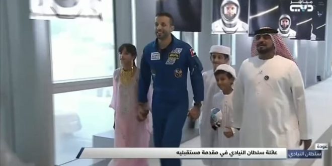 ولدى وصوله احتضن سلطان النيادي أبناءه، وفقا لما أظهرته لقطات مصورة لـ”تلفزيون دبي”.