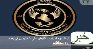 اعلنت مفارز وكالة الاستخبارات والتحقيقات الإتحادية، اليوم الاثنين، الإطاحة بتسعة متهمين بالإرهاب والمخدرات بينهم امرأة في عدة محافظات. وذكر بيان للوكالة، تلقته وكالة الموقف العراقي ان”مفارز وكالة الاستخبارات المختصة بمكافحة الارهـاب في محافظة نينوى نفذت عملية نوعية مستندة الى معلومات استخبارية اسفرت خلالها عن القاء القبض على (3) متهمين احدهم …